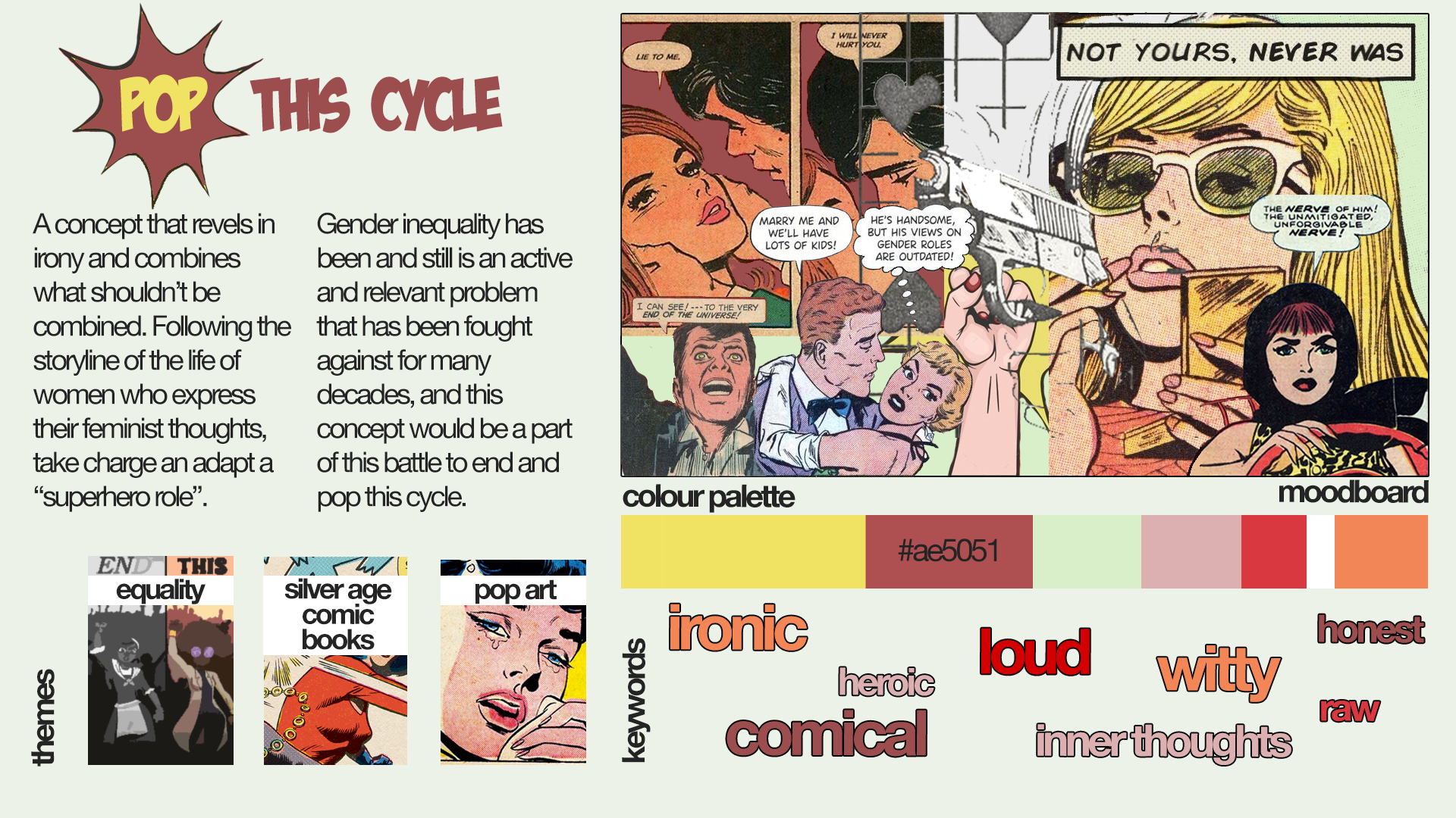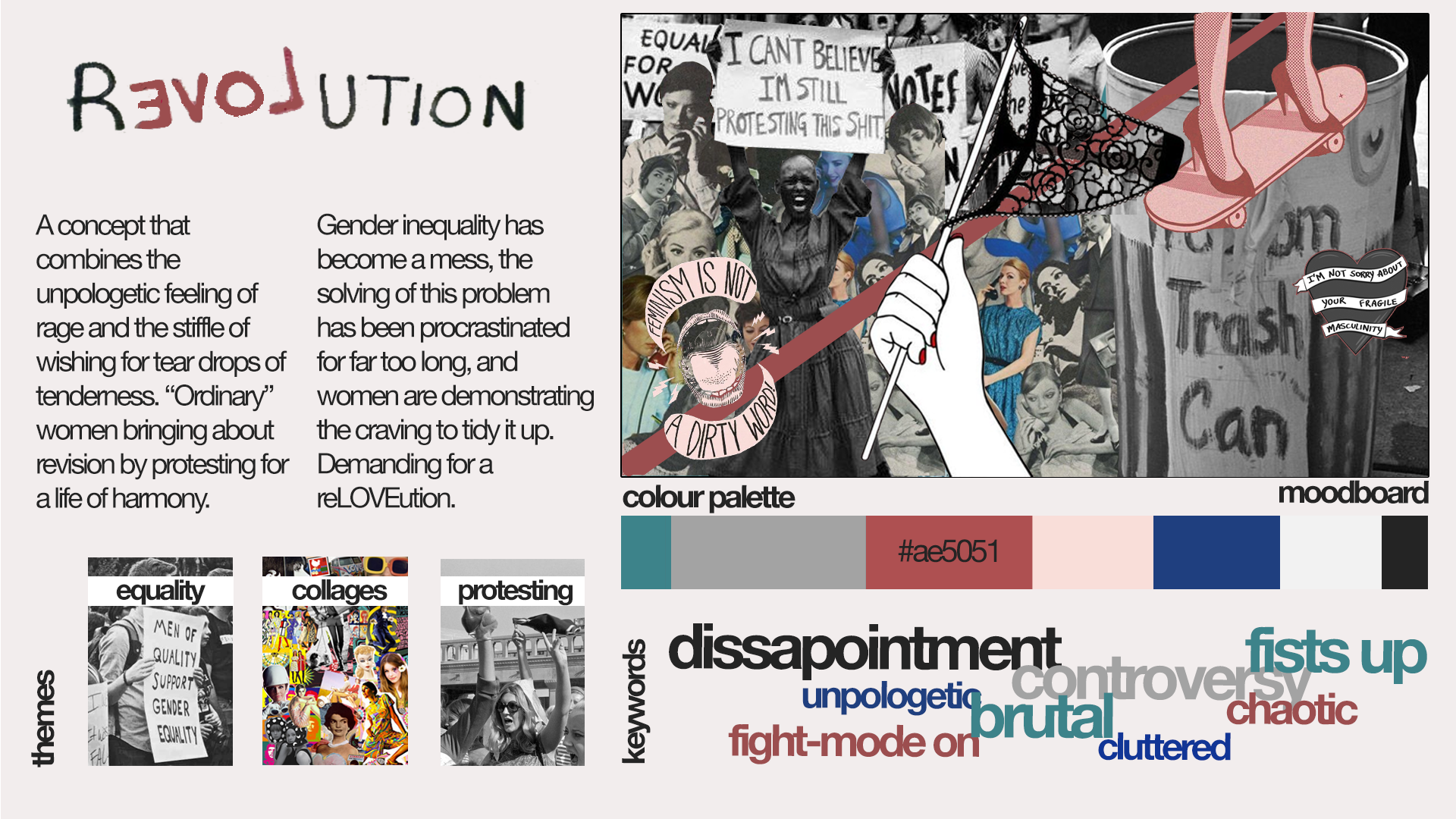 After a talk with Russ Gator, the founder of TSPTR, he said that the brand’s silhouettes can be worn by anyone, that the brand is worn 60% by men and 40% by women, and that it is meant to appeal to a wide age group. However, when analysing the brand, we* found that the silhouettes are overall masculine and the models are mostly men, and also that the main consumers are Generation X, which overall does not reflect what the brand aims to achieve.Therefore, we explored the topic of feminism, more specifically gender inequalities, however specifically from the point of view of women, thus aiming to appeal to this 40% of the brand’s customers that were not well represented. One of the main elements of the brand is the combination of a good aesthetic with a hidden message, also being inspired by the American countercultures of the 1960s.